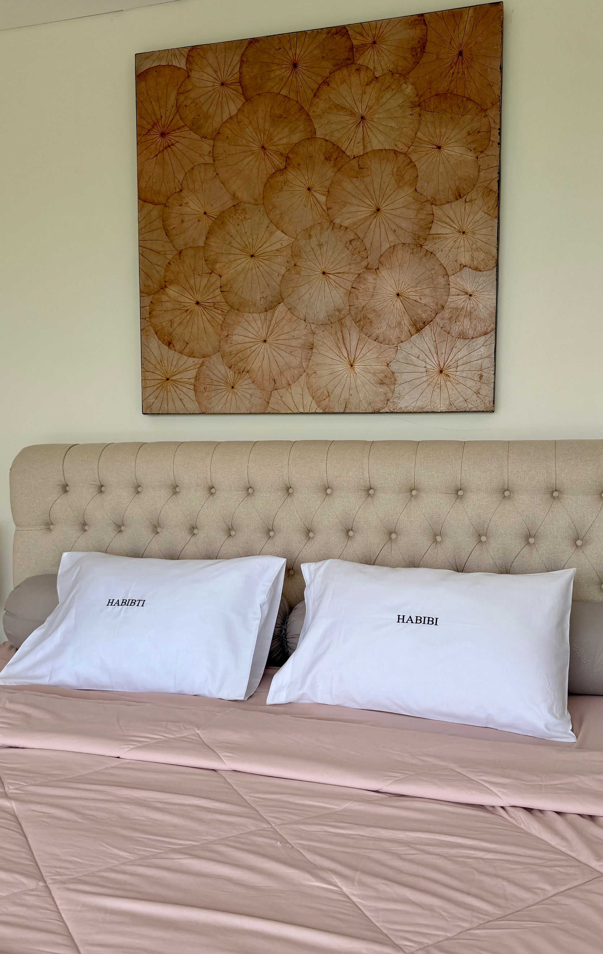 A matched set, just like you two. These Habibi & Habibti (my love) pillowcases are embroidered on 100% cotton, bringing cozy comfort and playful vibes to your bed.